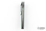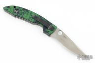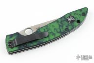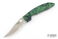 This 800S Linerlock folder by Benchmade has a satin finished blade with partial serrations, thumb hole, and notched thumb rest. Handle is green/black scales over titanium liners, black fiber back spacer, lanyard hole, and black stainless steel tip down clip. Excellent condition. Comes with original box and papers. "Mar. 2000" on blade
