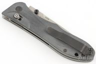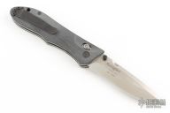 This axis locking folder by Benchmade features a satin finished spear point partially serrated blade with dual thumbstuds. The handle has black G-10 scales, stainless steel liners with notched thumb-rest, and black a stainless steel clip, tip up carry and reversible for right or left handed carry. This knife is an Elishewitz Design. Comes with original box and papers. Excellent condition. "Apr. 2000" on the blade.