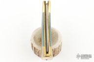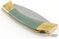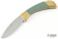 This South Pass Jade Knife by Browning features a polished blade with nail nick. The handle is comprised of dovetailed brass double bolsters with integral liners and Nephrite jade scales, and a stainless steel lock back. Includes original wooden display case and papers. Excellent condition. This knife is #589 of 2000 that were made.
