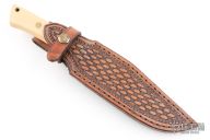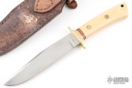 This knife by JP Jones features a satin finished blade with false top edge, .165" blade stock and 1.198" blade depth, hidden/mortise tang construction. The handle has a nickel silver guard and an ivory paper micarta grip. Comes with a hand tooled brown leather sheath. Excellent condition.