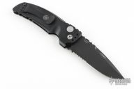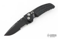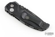 This EX-A01 by Hogue Knives is an Allen Elishewitz design, it features a black drop point partially serrated 154CM blade with notched thumbrest. The handle is black aluminum, tip up or down reversible black stainless steel clip. Has safety. Comes with Hogue box, papers and nylon sheath. Excellent condition.