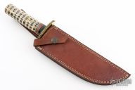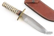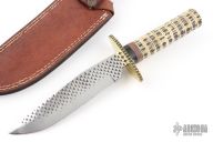 This Bowie by Two Charlies Custom Knives features a mirror polished blade made from a farrier's rasp, .171" blade stock and 1.377" blade depth, hidden tang construction. The handle has a fileworked brass guard, stabilized cactus grip with black and multicolor spacers. Comes with a brown leather sheath. Has some light scratches and patina, otherwise good condition.