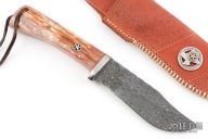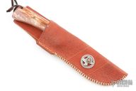 This knife by Roy Hill features a Damascus blade with fileworked spine and tang, .145" blade stock and 1.513" blade depth, full tang construction. The handle has a stainless steel guard, giraffe bone scales with red liners. Comes with a brown leather sheath. Excellent condition.