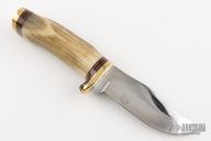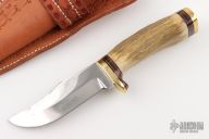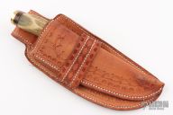 This knife by Frenchie Custom Knives features a mirror polished blade with .191" blade stock and 1.364" blade depth, hidden tang construction. The handle has a brass guard and butt, stag grip, and canvas micarta and white spacers. Comes with a hand tooled brown leather sheath. Has scratches, has pitting, has been sharpened, good user condition.