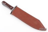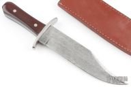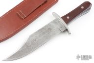 This bowie features a Damascus blade with false top edge, .158" blade stock, 1.709" blade depth, full tang construction. The handle has a steel guard, maroon paper micarta scales. Comes with a brown leather sheath, not original, but it fits.. Has some scratches and patina, otherwise excellent condition.