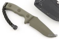 This Currahee by Microtech has a Cerakote OD Green blade with a standard edge and a green handle, notched thumbrest, .198" blade stock and 1.900" blade depth, full tang construction. Comes with original box and papers. Excellent condition. Dated 06/2022 and #5213.