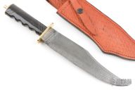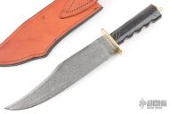 This bowie has a Damascus blade with false top edge, .229" blade stock and 1.784" blade depth, hidden tang construction. The handle has a brass guard and butt, carved buffalo horn grip. Comes with a hand tooled brown leather sheath. Has some light scratches and staining, has a nick in the blade edge, otherwise good condition.