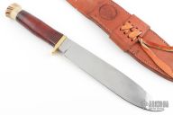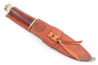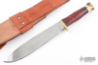 This camp knife features a mirror finished blade with .230" blade stock and 1.645" blade depth, hidden tang construction. The handle has a brass guard, stag butt, stacked leather grip and black/red/brass spacer pattern. Comes with a brown leather sheath. Has light scratches and patina, otherwise excellent condition.