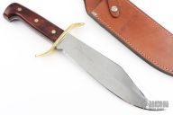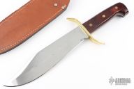 This W49 Bowie by Western Cutlery features a bowie blade with a false top edge, .168" blade stock and 2.094" blade depth, full tang construction. The handle has a brass s-guard, wood scales with brass pins. Comes with a brown leather sheath. Has some scratches and patina, oxidation on the tang, otherwise good condition. Comes with original box.