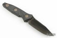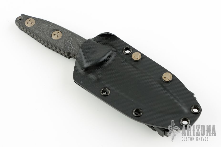 This Mini Socom Alpha by Microtech features a DLC drop point blade, a notched thumb ramp and a full tang construction, .163" Blade Stock. 1.189" Blade Depth. The handle features carbon fiber scales. Includes a kydex sheath with a belt clip. Dated 04/2022.  S/N 318. Comes with original box, sheath, and papers. Excellent condition.