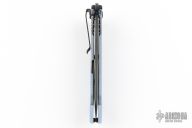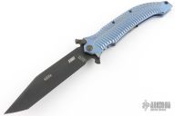 This AXD Assisted Framelock Flipper has a black tanto blade, dual thumb studs, and symmetrical flippers. Handle is anodized and milled titanium frame, stainless steel barrel spacers, and tip down stainless steel clip. Nice blade seating and lockup. Comes with original box, papers and padded zipper case. Has a few light scuffs, otherwise excellent condition.