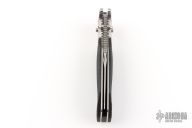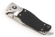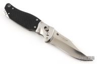 This SOG TomCat Axis Lock Folder has a VG-10 blade with dual thumb studs and a notched thumbrest. Handle is black rubber with satin finished stainless steel bolsters over stainless steel frame with notched thumb rest and black fiber back spacer. Has lanyard tube pin. Comes with SOG nylon velco sheath, original box and papers. Excellent condition. Still has plastic covers on the bolsters.