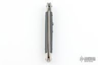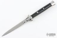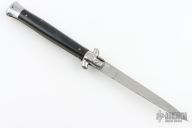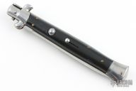 This Swivel Bolster Auto by Renzo Beltrame (marked "B Rostfrei) features a flat ground blade. The handle has stainless steel bolsters and pommel with black scales over brass liners and stainless steel backspacer. Has scratches, otherwise good condition.