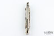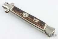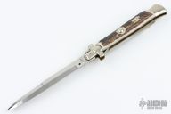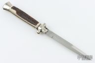 This Swivel Bolster Auto from A.G.A. Campolin features a mirror spear point blade with false top edge. The handle is comprised of nickel silver bolsters and pommel with stag scales over D-stamp brass liners and stainless steel backspacer. Has some scratches, otherwise excellent condition.