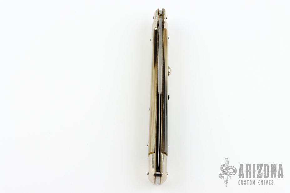 This large Pick Lock from A.G.A. Campolin features a mirror polished bayonet ground blade with a false top edge. The handle has nickel silver bolsters and pommel with Honey horn scales over D-stamp brass liners and stainless steel backspacer. Has some light scratches, otherwise excellent condition.