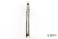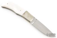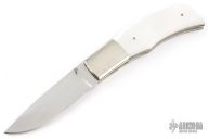 This lockback folder from Jay Harris features a hand rub satin finish blade with a single thumbstud. The handle dovetailed nickel silver bolsters, mother of pearl scales with black liners, nickel silver liners, stainless steel backspacer. Has some scratches, otherwise good condition. Comes with a felt velcro case.