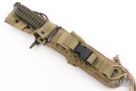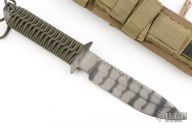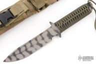 This Large MT fighter from Strider Knives with tiger stripe blade with sharpened and serrated top edge, .248" blade stock and 1.490" blade and paracord wrapped handle. Comes with a nylon belt sheath. Has some light scuffs, excellent condition.