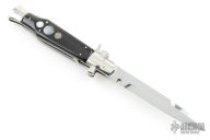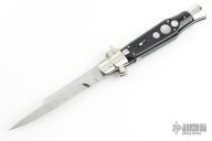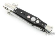 AGA Campolin 11" Blackwidow with Brazil Horn! This Campolin made automatic knife has solid nickel silver bolsters with maltese cross in the hilt. To close this one you use the lock back release at rear of the handle. This makes for very tight and stable construction and it's a bit more robust because of that. Has a mirror polished blade with false top edge. The nickel silver liners and a stainless steel backspacer. Buffalo horn scales with black lip pearl inlays. Excellent Condition.