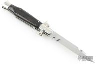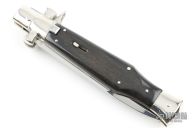AGA Campolin 11" Blackwidow with Brazil Horn! This Campolin made automatic knife has solid nickel silver bolsters with maltese cross in the hilt. To close this one you use the lock back release at rear of the handle. This makes for very tight and stable construction and it's a bit more robust because of that. Has a mirror polished blade with false top edge. The nickel silver liners and a stainless steel backspacer. Ebony wood inlays. Excellent Condition.