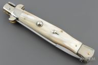 This Picklock Auto by Renzo Passcotto features a mirror finished blade with unsharpened edges. The handle has French Tip Horn scales, brass liners and nickel silver bolsters. Has safety. Excellent condition. 12 of these were made with French Tip Horn
