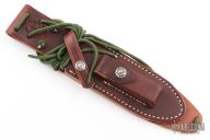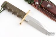 This Model 15 Airman by Randall Made Knives features a clip point blade with a sharpened top edge, .225" blade stock. 1.254" blade depth, full tang construction. The handle has green linen micarta handle with finger grips and a brass guard. The Model 15 is designed especially for heavy-duty use and to be as nearly indestructible as possible. Comes with a brown leather sheath and original paper wrapping. Excellent condition.