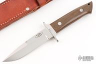 This Chute Knife by RL Dozier features a hand ground mirror polished blade with false top edge, .187" blade stock and 1.052" blade depth, full tapered tang construction. This knife was hand ground and made solely by Bob Dozier. The handle has a stainless steel guard, green canvas micarta scales with thin red liners. Has lanyard hole at the butt. Comes with a brown leather sheath and original paper wrapping. Excellent condition.