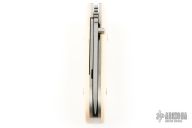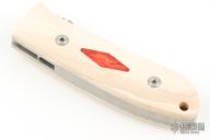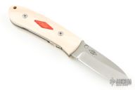 This DK-FHM linerlock folder by Dozier Knives has a satin finished D2 stainless steel drop point D2 blade with notched thumbrest and single thumb stud. Handle is has mammoth ivory scales with red coral inlays, titanium liners and a titanium backspacer. Excellent condition. Beautiful knife. Comes with a zippered case.
