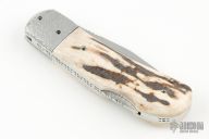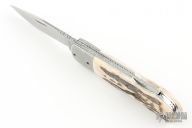 This Lockback Folder by Truncali Custom Knives features a hand rub satin finished blade with nail nick and file worked blade spine. The handle has stippled stainless steel bolsters and stag covers over stainless steel liners and fileworked backspacer. Comes with a zippered case. Dated 2023. Excellent condition.