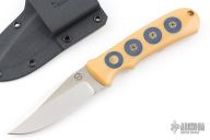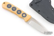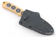 This KM-3 Agent by Dozier knives features a satin finished blade with false top edge, .150" blade stock and 1" blade depth, full tang construction. The handle has ivory linen micarta scales with slate gray G-10 inserts and mosaic and brass pins. Comes with a horizontal kydex sheath. Excellent condition.