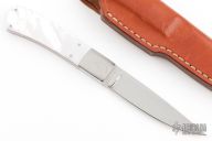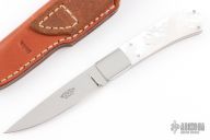 This bird and trout knife by Michael Gregory features a mirror finished blade with .114" blade stock and .682" blade depth, full tang construction. The handle has dovetailed stainless steel bolsters, mother of pearl scales with red liners. Comes with a brown leather sheath. Excellent condition.