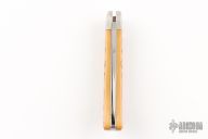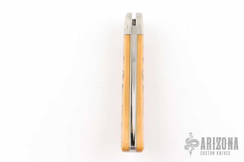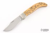 This slipjoint by Fred E Weber features a mirror polished blade with nail nick. The handle has nickel silver bolsters and liners, yellow paper micarta covers and a stainless steel spring. #7 on the ricasso. The bolsters have been engraved and the covers have been scrimshawed. Has a couple very light scratches, otherwise excellent condition.