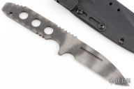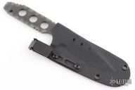 This TAD edition Fixed Blade by Strider Knives features a tiger striped blade with nearly sharpened top edge and notched thumbrest, .193" blade stock and 1.035" blade depth, full skeletonized construction. Comes with a kydex sheath. Has scuffs, otherwise good condition otherwise.