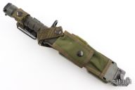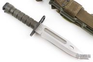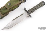 This M9A1 Phrobis Int'l features a bead blasted spear point blade with sawteeth on the spine and a large fuller, .235" blade stock and 1.420" blade depth, hidden tang construction. The handle has a black steel guard and green plastic grip and can be removed from the handle for cleaning. Comes with original green sheath. Has some sheath marks and light scuffs, otherwise excellent condition.
