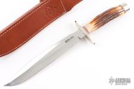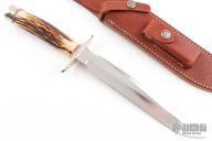 "The Model 1 by Randall Made Knives was made famous by Allied combat troops in World War II and has since been widely used in all theaters of war." This knife features a satin finished blade with a sharpened top edge, .208" blade stock and 1.170" blade depth, hidden tang construction. The handle has a nickel silver guard and butt, stag grip with red/white/blue spacers. Includes original brown leather sheath. Has a couple light scratches and a couple small spots on the blade, otherwise excellent condition.