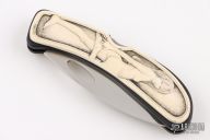 Has scrimshaw bone scales. Has a couple light scuffs, otherwise excellent condition. Comes with zipper case.