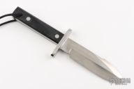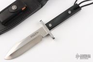 This Model 17 Astro by Randall features a satin finished spear point blade with false top edge, .235" blade stock, 1.373" blade depth, full tang construction. Stainless steel guard, black linen micarta scales, fastened with removable stainless steel bolts. A slot in the heavy tang and matching hollow inside the handle may be used to carry matches, fishhooks, line and other survival items. The Model 17 was especially designed for the seven Mercury astronauts who carried them on America's first manned space flights. Astronaut Gordon Cooper did the final design, and two of these historically valuable knives are on display in the Smithsonian Institution. Includes black leather sheath with stone and original paper wrapping. New from maker.