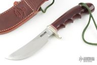 This Model 20 Ward Gay Special (non-catalog model) features a satin finished upswept carbon steel blade with notched thumbrest, .203" blade stock and 1.145" blade depth, hidden tang construction. The handle has a nickel silver guard, maroon linen micarta grip, red/white/black spacers and a lanyard hole at the butt. Comes with brown leather sheath and original paper wrapping. New from maker.