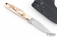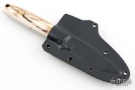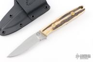This K-35 by Dozier Knives features a satin finished clip point blade with .125" blade stock and .752" blade depth, full tang construction. The handle has sambar stag scales with brass pins and lanyard tube. Comes with kydex sheath. New from maker.