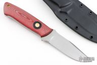 This KM-5 Bodyguard by Dozier Knives features a satin finished blade with false top edge, .175" blade stock and .980" blade depth, full tang construction. The handle has red  linen micarta scales with black linen micarta insert, black liners, brass pins and lanyard hole. Comes with kydex sheath with belt loop. New from maker.
