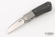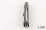 This Apache Front Flipper by Enrique Pena features a satin finished blade with a front flipper and notched thumbrest. The handle has titanium bolsters, black micarta scales with a titanium backspacer and matching tip up pocket clip. Includes a Pena X-Series padded box. Has a few light scuffs, otherwise excellent condition.