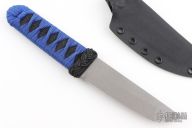 This 5" Oregonto from Ben Tendick of B.R.T. Bladeworks features a tumbled tanto style blade with swedge, .186" blade stock, 1.261" blade depth. The handle features a black and blue wrap over a black hemp cord under wrap. Includes a kydex sheath. Excellent condition.