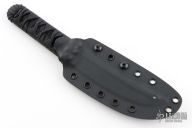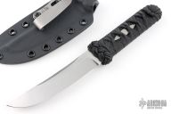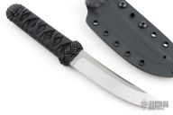 This Kwaiken from Ben Tendick of B.R.T. Bladeworks features a satin finished blade with swedge, .205" blade stock, .950" blade depth. The handle features a black wrap over a black hemp cord under wrap and a hammered titanium menuki. Includes a kydex sheath. Excellent condition.