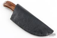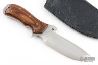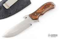 This Mountain Man Hunter from Phil Hartsfield features a satin finished double ground blade with false top edge, .185" blade stock and 1.206" blade depth, full tang construction. The handle has wood scales with brass pins. Includes a brown leather covered and lined metal sheath. Excellent condition.