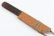 This is kwaiken by Phill Hartsfield has a chisel ground blade with .054" blade stock and 1.105" blade depth, hidden tang construction. The handle has epoxied black cord wrap over copper. Includes the original paper lined, leather covered metal sheath. Excellent Condition.