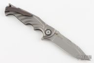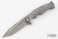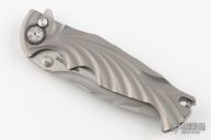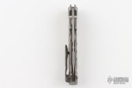 The matte finished, ergonomic titanium handle has been heavily fluted providing a beautiful, yet incredibly comfortable grip. This integral handle is machined from one solid piece of titanium, showing off tremendous machining skills. A zirconium pivot collar surrounds the custom pivot, providing an elegant contrast against the matte finished titanium. Zirconium is a transitional metal that is primarily mined in South Africa and Australia. It is highly resistant to corrosion and scuffing. The knife is finished with a matching fluted zirconium pocket clip that is mounted for right-handed, tip-up carry.
