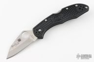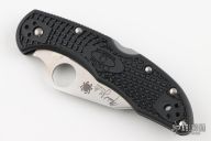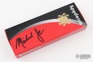 This knife by Spyderco was customized by Michael Janich, it has a satin finished blade with thumbhole opener and notched thumbrest. The handle has black FRN scales and a 4-way reversible stainless clip. Comes with original signed box, and signed COA. Excellent condition.