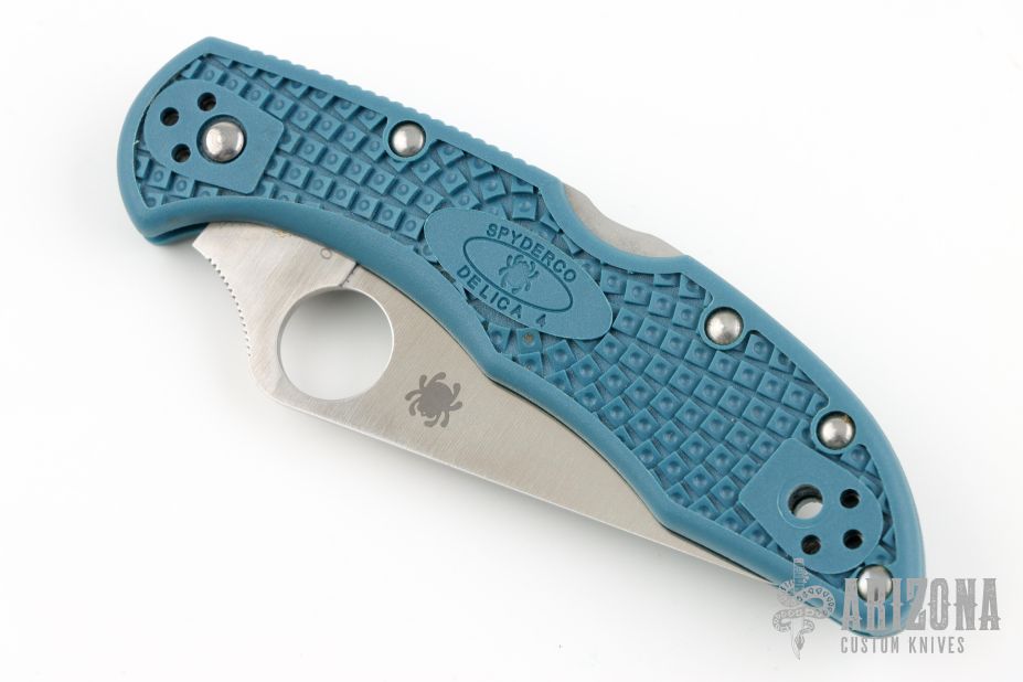 Spyderco Delica knives with K390 steel blades. Bohler-Uddeholm developed K390 MICROCLEAN to provide the extreme wear resistance and high compressive strength needed for demanding industrial applications. As a blade steel, K390's exceptional toughness and wear resistance lend themselves well to thin, high-performance edges—including the teeth of serrated edges. The SpyderEdge versions of the Spyderco Delica 4, Endela, and Endura 4 not only take full advantage of K390's remarkable properties, they also add the low-friction edge geometry of a full-flat grind. Like all members of Spyderco's K390 family, their Bi-Directional Textured FRN handles are molded in the distinctive blue color of the breed.