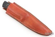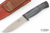 This Model F1 features a Laminated 420 and 3G Core with a satin finish. .174" blade stock and 1.065" blade depth. Hidden tang construction. Rubber handle with the end of the tang protruding through the butt. Comes with a brown leather sheath. Has a couple light scuffs, excellent condition otherwise.