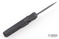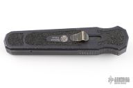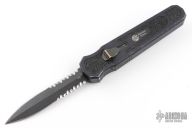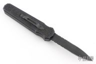 This Harkins Triton OTF Auto has a black double-edged partially serrated blade. The handle is black aluminum with non-slip inserts and black finished tip down clip. Has scuffs and scratches otherwise the knife is in good condition.