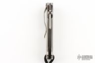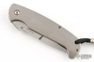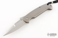 This knife by WR Clark features a hand ground satin finished blade with dual thumbstuds and notched thumb ramp. The handle has orange peel finished titanium scales, a single titanium liner and tip down stainless steel clip. Black backspacer. Nice detent, lockup and blade seating. Has a couple light scuffs, excellent condition otherwise.